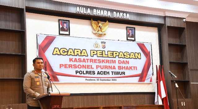 KabarLiputan.id, ACEH TIMUR – Momen perpisahan selalu menghadirkan keharuan, terutama bagi personel yang telah mengabdi puluhan tahun di institusi Kepolisian. Hal ini juga dirasakan dalam acara pelepasan AKP (Purn) Muhammad Daud yang memasuki masa purna tugas di Polres Aceh Timur, Polda Aceh. Selain melepas satu personel yang purna tugas, Kapolres Aceh Timur AKBP Irwan Kurniadi, S.I.K. pada Selasa, (23/09/2025) siang juga melepas Kasat Reskrim Iptu Adi Wahyu Nurhidayat, S.TrK.,S.I.K. yang pindah tugas ke Polda Jawa Tengah.