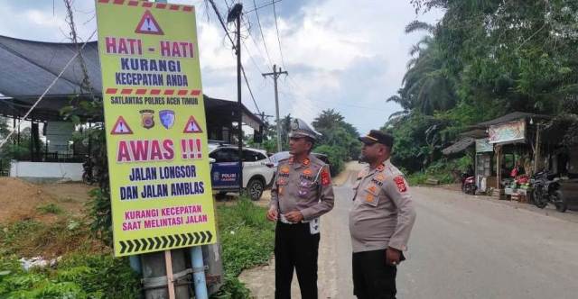 Pascabencana Hidrometeorologi, Satlantas Polres Aceh Timur Pasang Spanduk Himbauan di Lokasi Rawan Longsor