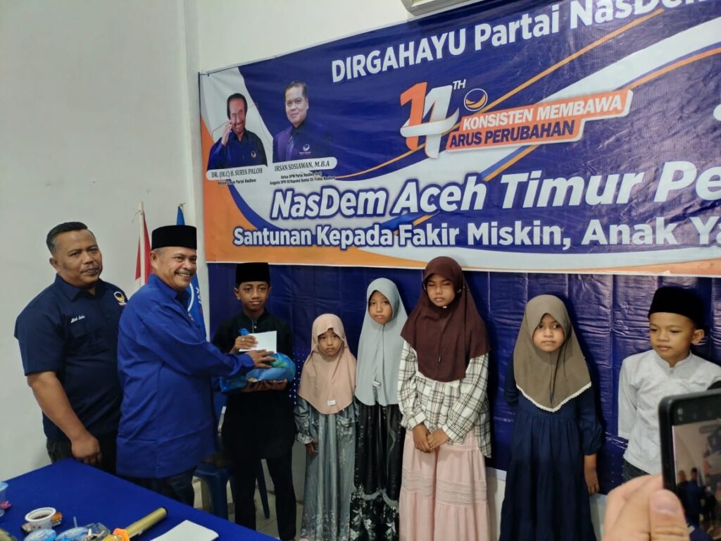 Acara ini dibuka oleh Sekretaris DPD partai NasDem Aceh Timur, Sartiman, dihadiri Ketua DPD H Tarmizi Daud, para anggota DPRK, Mat Rais, Johar Fahlani, Tgk Muhammad Adam, para kader partai, fakir miskin dan anak yatim.