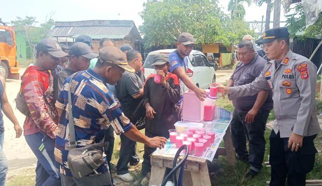 Kabupaten Aceh Timur. Dalam kegiatan ini, personel Polsek Idi Rayeuk membagikan minuman dan kue kepada para buruh Federasi Serikat Pekerja Transport Seluruh Indonesia (F.SP.TSI-SPSI) Idi Kota yang tengah beristirahat usai bekerja.